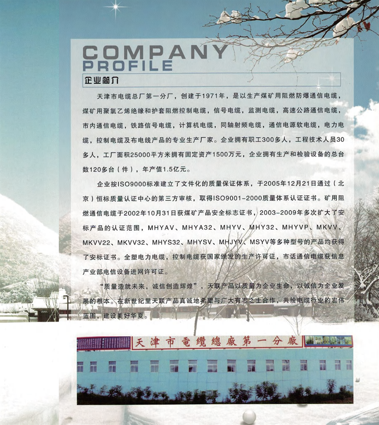 公司简介天津市电缆总厂第一分厂创建于1971年,是我国电线电缆主要生产厂家之一,是电线电缆高新产品生产、研发、销售的现代化企业。我厂位于河北省廊坊市大城县毕演马工业区内,地处京、津、冀大三角带,依临京九、京浦、朔黄铁路和京开、沧廊沧、京沪高速,地理位置优越,交通运输便利。我厂占地面积20000多平方米,职工500多人,技术人员60人,生产设备120台套,检测设备先进。生产煤矿用阻燃通信电缆、煤矿用阻燃信号 ...